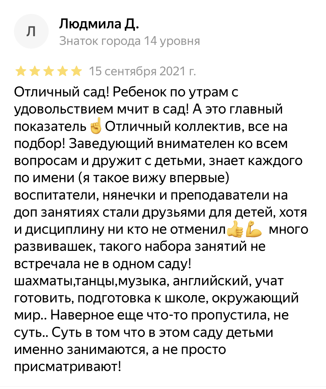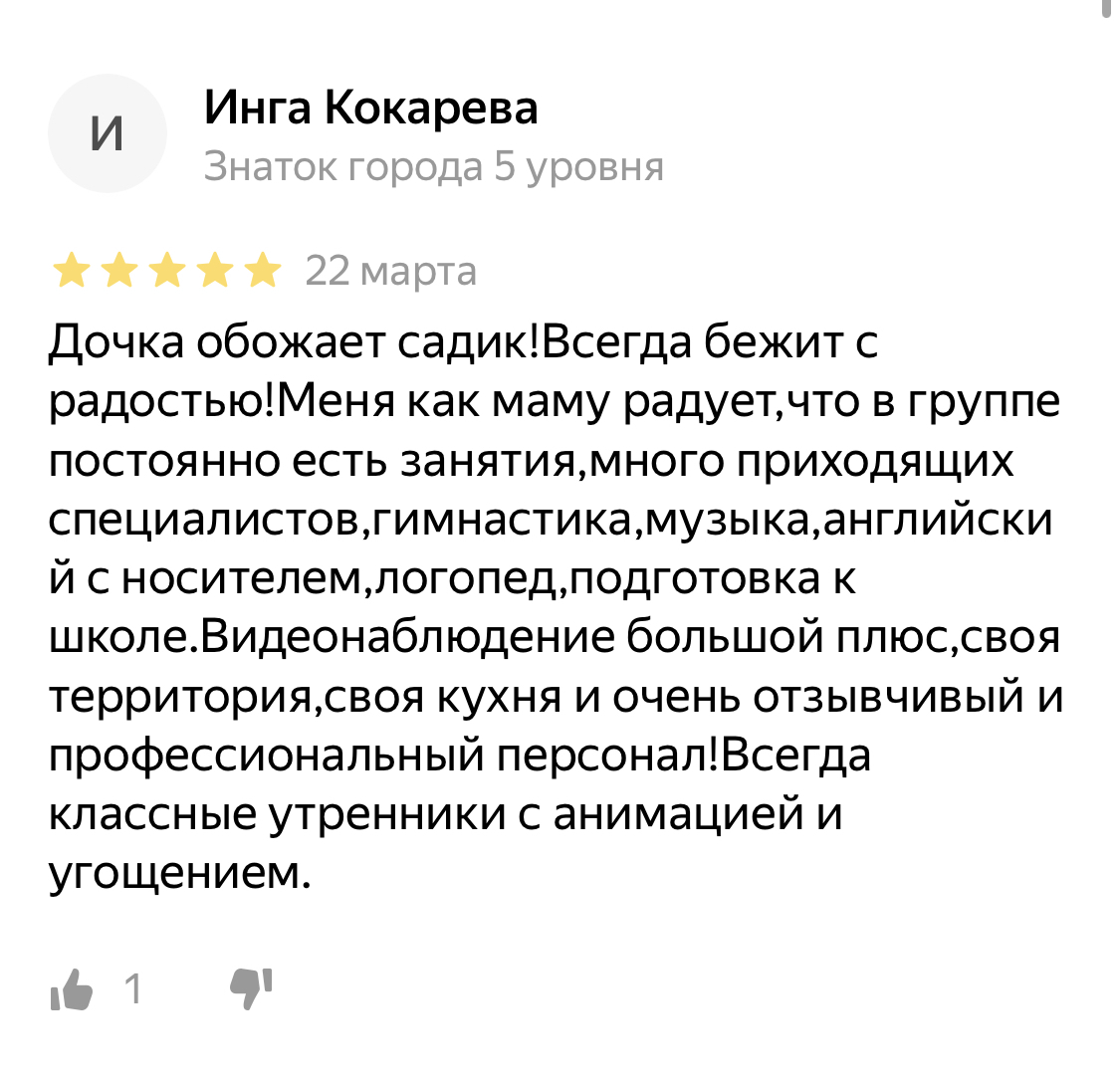 Лучший детский сад! Я в полном восторге. Все для комфорта детей и родителей. Индивидуальный подход на высшем уровне, учитываются все пожелания родителей. Коллектив замечательный ( ребёнок ходил в самую младшую группу, Елена Николаевна радовалась иногда больше родителей новым достижениям ребёнка). Видеонаблюдение, большая площадь, своя площадка, доступная цена, английский язык с носителем для старших групп, мастерклассы, театры и т.д. Огромная благодарность директору детского сада. Николай прошёл с нами весь путь адаптации. Он всегда готов помочь и умеет завлечь ребёнка. Очень любит детей и это чувствуется , атмосфера в саду тёплая. Был период когда ребёнок шёл утром именно к дяде Коле покормить кролика. Николай относится ко всему с пониманием, всегда найдёт время и уделит внимание каждому ребёнку несмотря на занятость. Для родителей , чей график нестандартный на работе , очень удобно сделано и можно прийти в сад за доп. Плату и в праздничные дни и даже на ночь. С видеонаблюдением ты всегда спокоен и видишь , чем занимается твой ребёнок. Впечатления от сада самые лучшие, рекомендую!